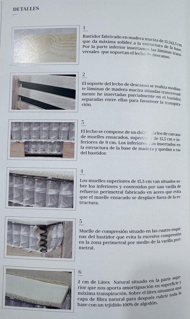 El sobre de la base de descans està compost per un doble nucli de carcasses de molles ensacades, les superiors de 13,5 cm i les inferiors de 9 cm. Les inferiors van insertades directament sobre l'estructura de fusta i queden anivell del bastidor.