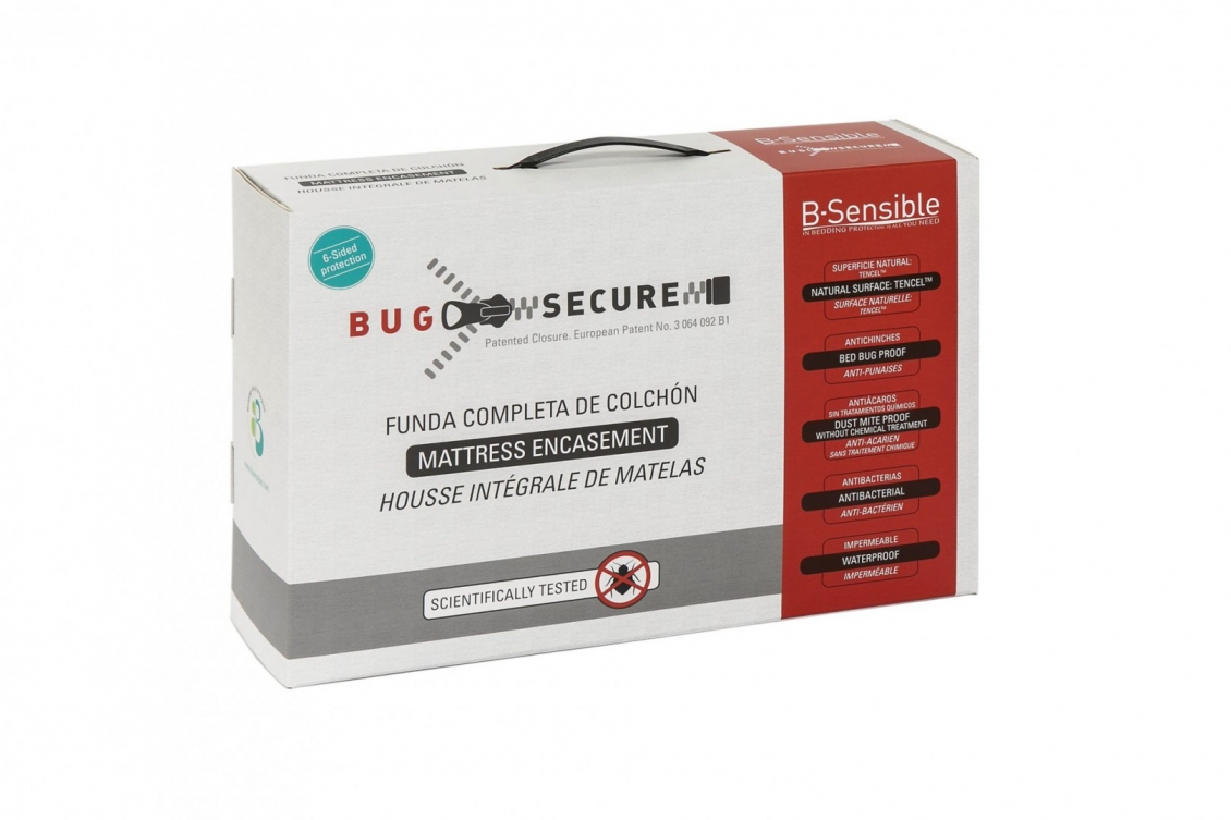 La funda de matalàs Bugsecure de B-Sensible ofereix un protecció total dels 6 costats del matalàs amb un tractament natural. Tant la superfície com els laterals estan fets amb la fibra natural Tencel ™. A la part inferior trobem polièster laminat amb una membrana de poliuretà. Tots aquests materials permeten una transpirabilitat i impermeabilitat màxima.