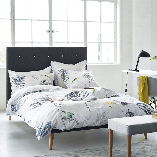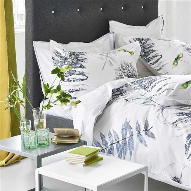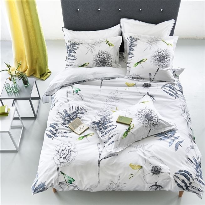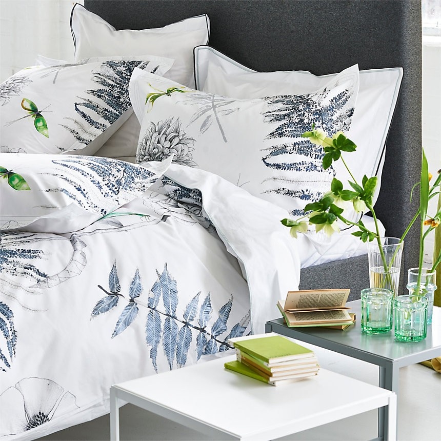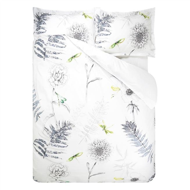 Elegant funda d'edredó 100% Cotó percale de 200 Fils i disseny floral amb una composició botànica de flors i falgueres aquarel·les suaus. Impressió digital, solapa blanca llisa.