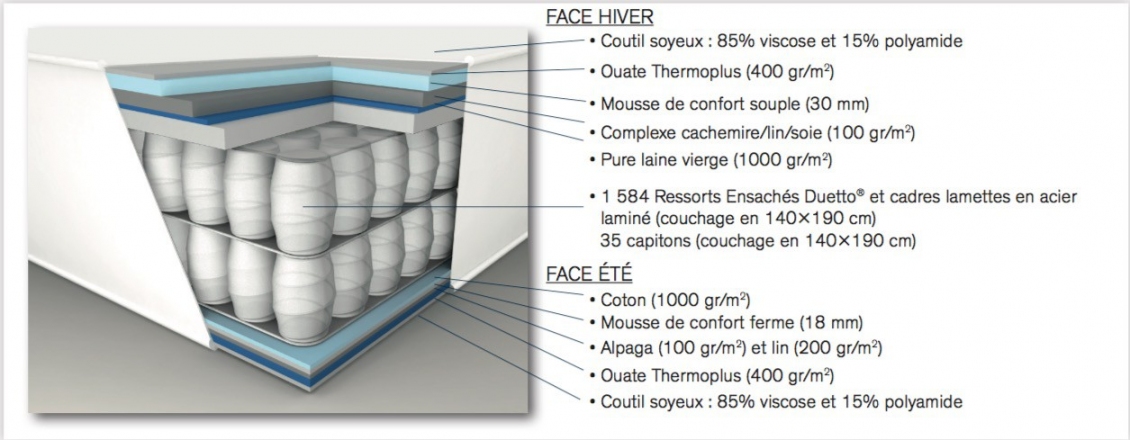 Deixe't seduir per les prestacions excepcionals d'aquest matalàs d'alta gamma: un acolliment suau, un suport independent i progressiu per cada part del cos... Deixe't seduir per la seva estètica refinada i els encoixinats naturals: llana pura, caixmir i seda natural per un confort acollidor per tot l'hivern, coto pur, lli i seda per una agradable sensació de frescor per l'estiu.