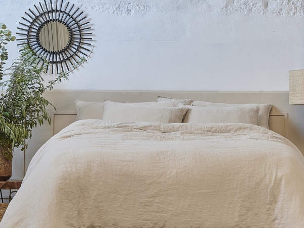 Funda nòrdica 100% lli d'origen francès. Col·lecció elegant, còmoda i fresca. Perfecte per a les nits d'estiu. Una col·lecció hipoal·lergènica i sostenible. Disponible en tons suaus, combinant colors terra i naturals, com blanc, beix i gris.